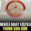 24 Haziran'da yapılacak Cumhurbaşkanı ve 27. Dönem Milletvekili Genel Seçimleri için siyasi parti genel merkezleri, seçime katılacakları seçim çevrelerine ait milletvekili aday listelerini en geç yarın saat 17.00'ye kadar Yüksek Seçim Kuruluna (YSK) verecek.