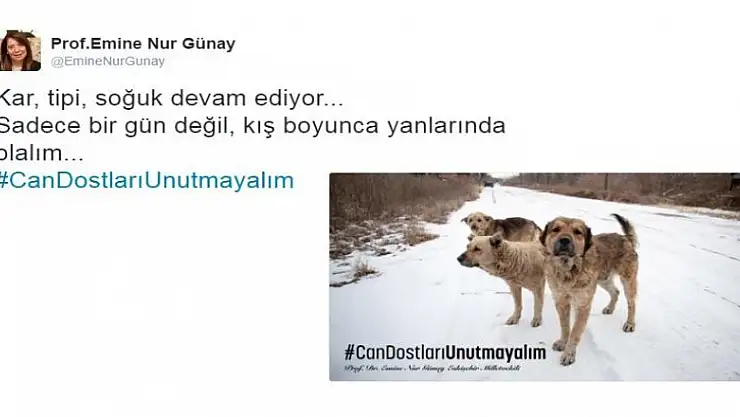TBMM FETÖ'nün Darbe Girişimini Araştırma Komisyonu Üyesi ve AK Parti Eskişehir Milletvekili Emine Nur Günay, soğuk havanın etkisini ülke genelinde hissettirdiği bu günlerde sokak hayvanları için sosyal medya hesabı Twitterüzerinden kampanya başlattı.