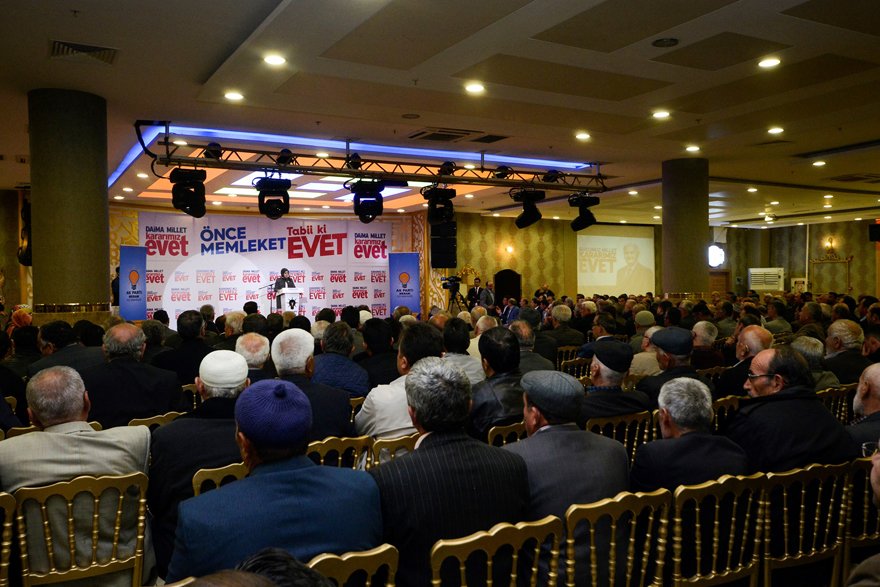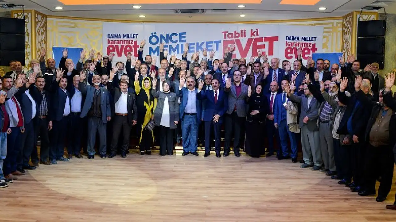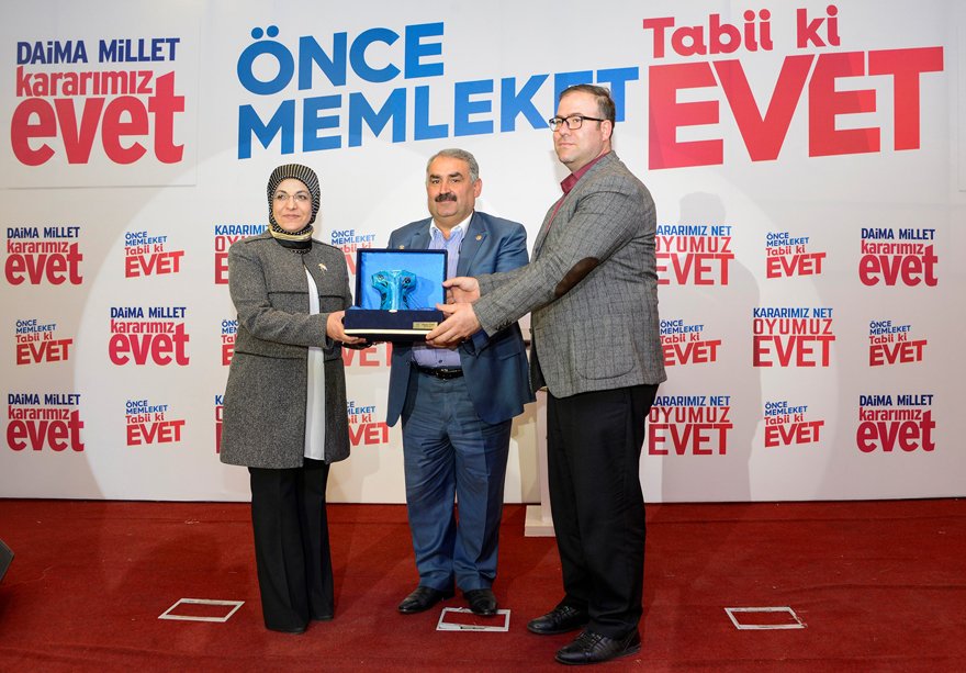 Konya Muhtarlar Derneği Başkanı Celal Duran ise, “16 Nisan’da Konya’daki 1200 muhtarımızla hep birlikte ‘Evet’ diyoruz. 1,5 ay boyunca Konyamızın ilçelerini gezdik. 16 Nisan’da büyük Türkiye için hep birlikte ‘Evet’ diyeceğiz” ifadelerini kullandı.