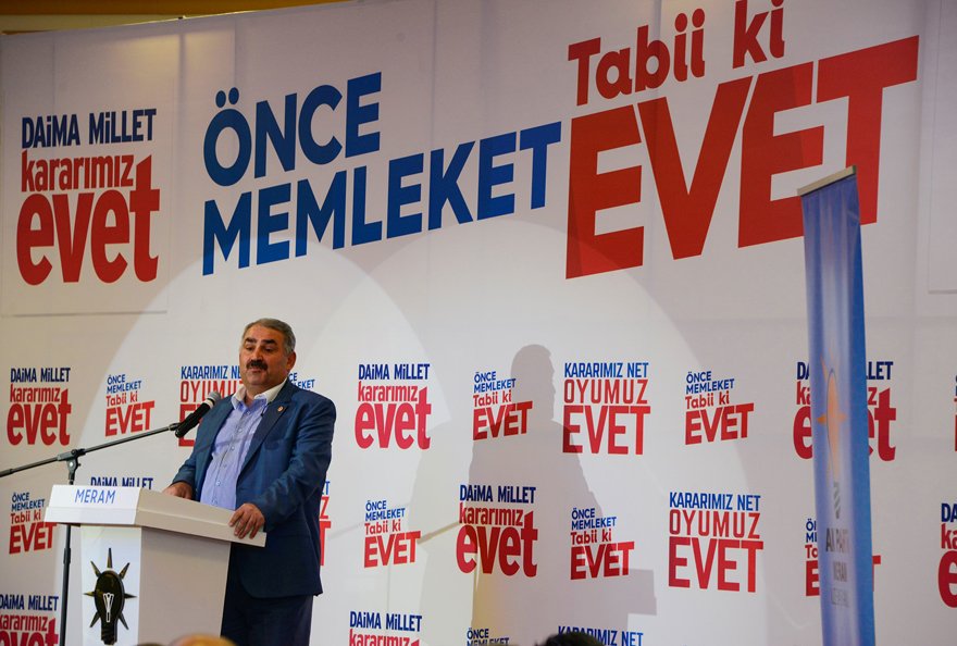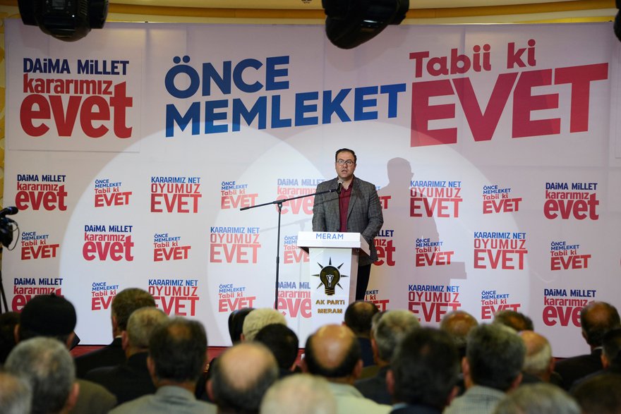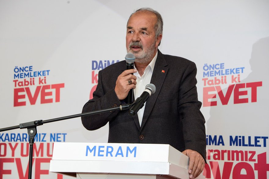 16 Nisan’da yapılacak halkoylamasının tarihi öneme haiz olduğunu vurgulayan AK Parti Meram İlçe Başkanı Abdülkadir Özöğür ise, “16 Nisan, Türkiye’nin prangalarından kurtulacağı bir tarih olacak. Huzur, güven ve istikrar üçlüsüne ek olarak yapılacak kamusal değişiklikle tüm vesayetleri inşallah kaldırmış olacağız. Hızlı karar alan, hesap verebilir bir yönetim sistemine geçilecek, koalisyonların olmayacağı, çift başlılığın ortadan kalkmasıyla orta ve uzun vadede nitelikli yatırımların önü açılacak. Herkes işine gücüne bakacak. Genç kardeşlerimizin geleceğe güvenle bakacağı, inisiyatif alacağı, ‘ben de varım’ diyeceği bir döneme geçilecek. Sürdürülebilir istikrar süreciyle işsizliğin azaldığı, eğitim kalitesinin yüksek olduğu bir nesil ile daha müreffeh bir yaşama hep birlikte kavuşacağız” ifadelerini kullandı.