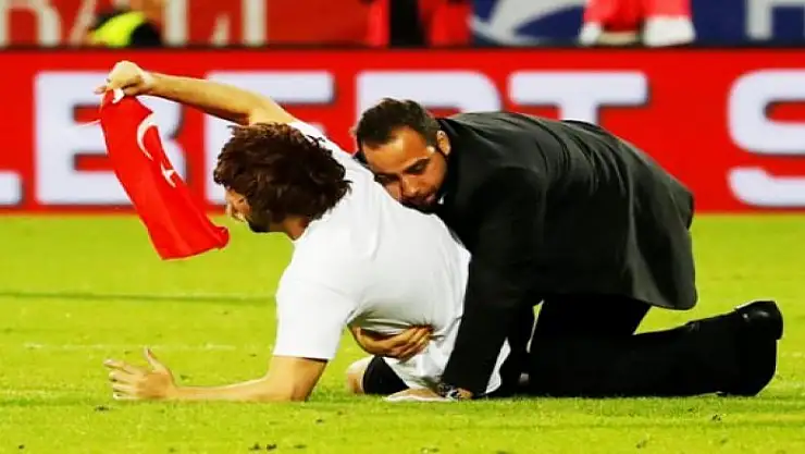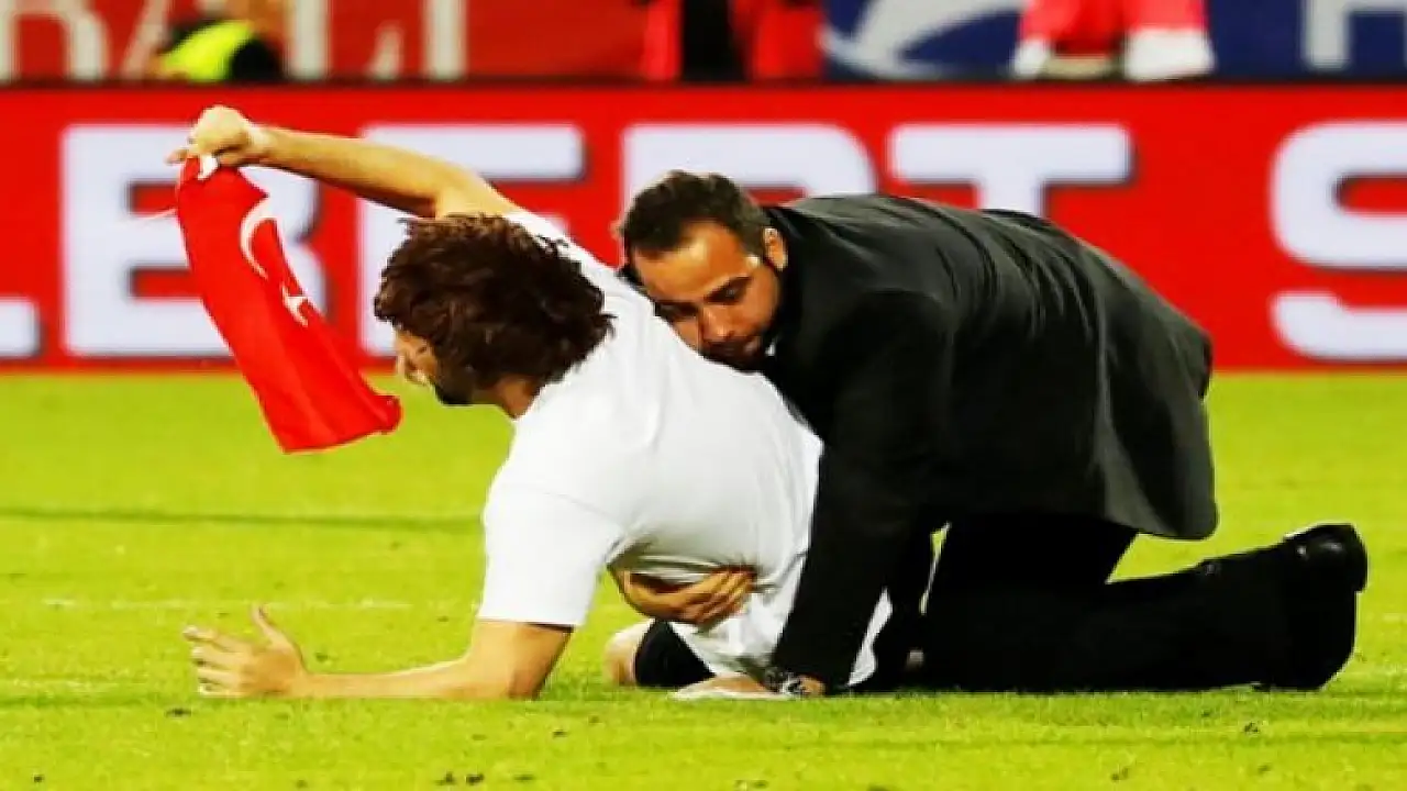 Maçın ilk yarısının sonlarına doğru güvenlik güçlerini atlatarak sahaya giren taraftar, elindeki Türk bayrağını saha ortasında açtı. Güvenlik görevlilerinin müdahalesine rağmen bir süre daha bayrağı göstermeye devam eden taraftar sonrasında saha kenarına alındı.