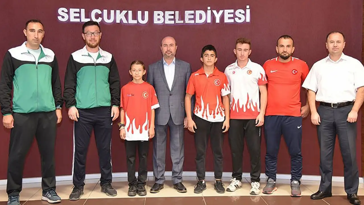 Selçuklu Belediyespor Kulübü'nde Uluslararası turnuvalarda madalya kazanan Milli Sporcular ve Antrenörleri Selçuklu Belediye Başkanı Ahmet Pekyatırmacı'yı makamında ziyaret etti.