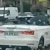 Bursa'da şehir merkezinde üstü açık lüks spor aracıyla seyahat eden bir sürücü, yağmurun başlamasıyla birlikte açılır tavanı kapatmak yerine şemsiyesiyle yola devam etti. O anlar kameraya yansıdı.