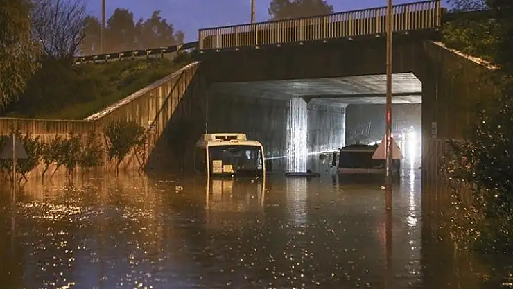 Adana'da etkisini sürdüren sağanak yağış sonrasında köprü altında biriken su nedeniyle minibüste mahsur kalan kişi botla kurtarıldı.