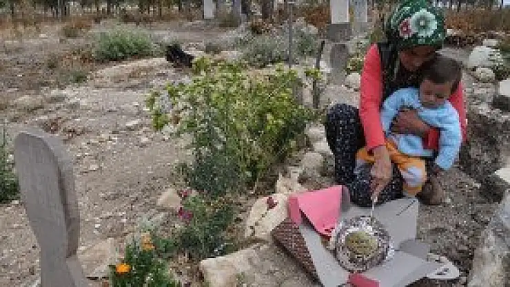 Genç kadın, eşini kaybettiği gün kucağına aldığı Hüseyin Arda'nın ilk yaş gününde eşinin mezarının bulunduğu Kazancı beldesindeki kabristanlığa gitti.