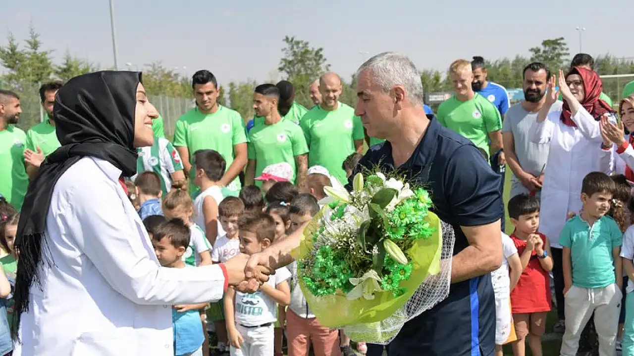 Konyaspor'un Kayacık Tesisleri'nde yaptığı antrenmanı Akıllı Minikler Kreş ve Anaokulları'ndan gelen minik öğrenciler ve öğretmenleri de takip etti