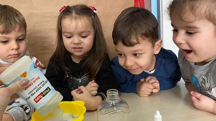 Çilimli Anaokulu'nda bilim ve teknoloji haftası etkinliği gerçekleştirildi. Okul yönetimi, 3 yaşındaki öğrencilere sabunun nasıl yapılacağı ile ilgili bilgiler verdi. Yapımı hakkında bilgilenen öğrenciler ise kendi sabunlarını yaptı. Deney kitinin içerisinde bulunan malzemeleri sırasıyla kaba koyan öğrenciler, kendi sabunlarını elde etti. Karışımdan elde edilen sabunla öğrenciler ellerini yıkadı.