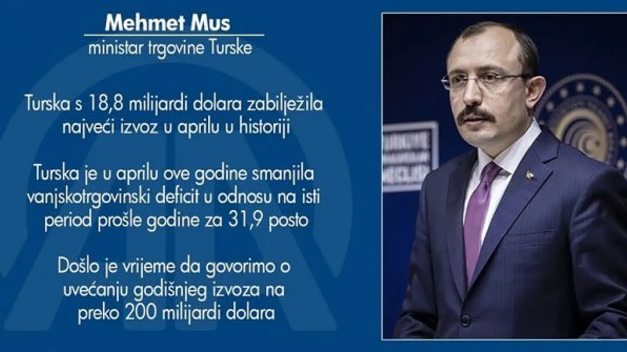 Ministar trgovine Republike Turske Mehmet Mus saopćio je da je ta zemlja u aprilu ove godine ostvarila izvoz u vrijednosti od 18,8 milijardi dolara i da je to rast od 109 posto i ujedno najveći aprilski izvoz u historiji, javlja Anadolu Agency (AA).