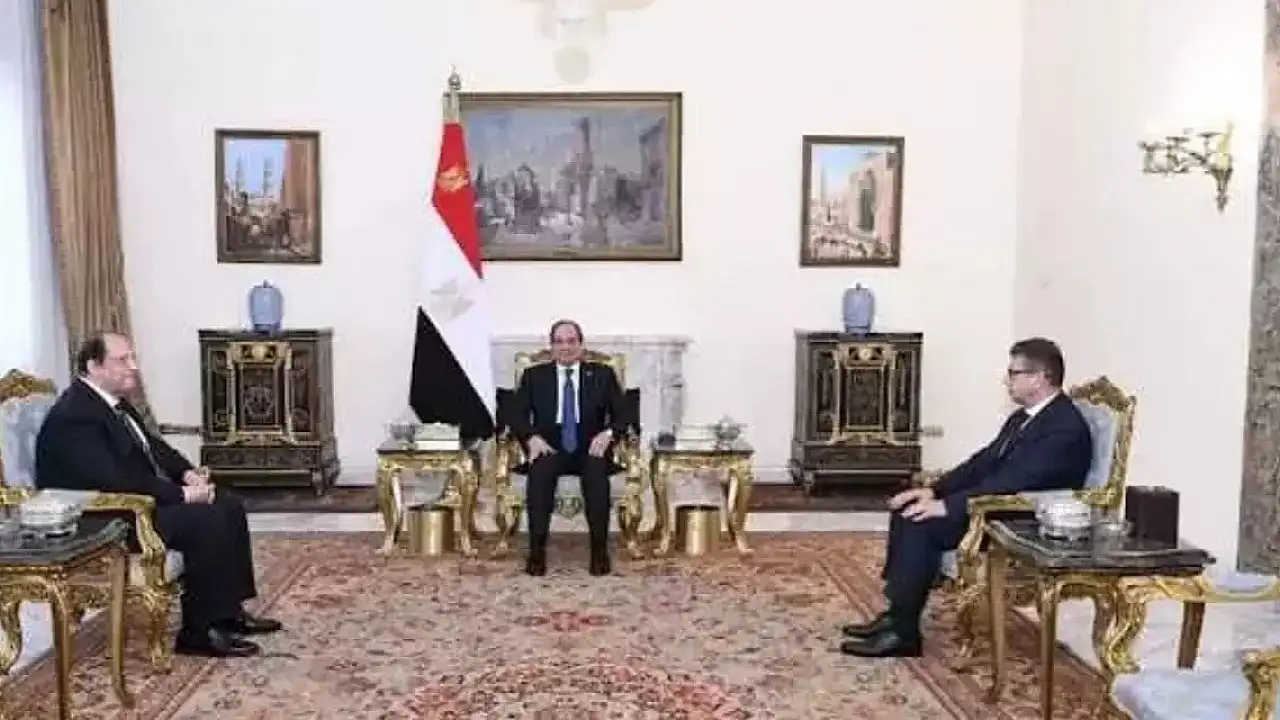 Mısır Cumhurbaşkanı Abdülfettah es-Sisi, yeni İstihbarat Başkanı Hasan Mahmud Reşad ve selefi Abbas Kamil (solda)