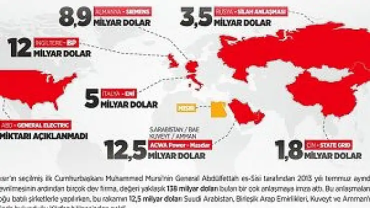 Mısır'da darbe sonrası yönetime gelen Sisi ile ticari ilişkilere hız veren Batılı ülke ve şirketler, Mısır'la yaklaşık 138 milyar doları bulan anlaşma imzaladı.