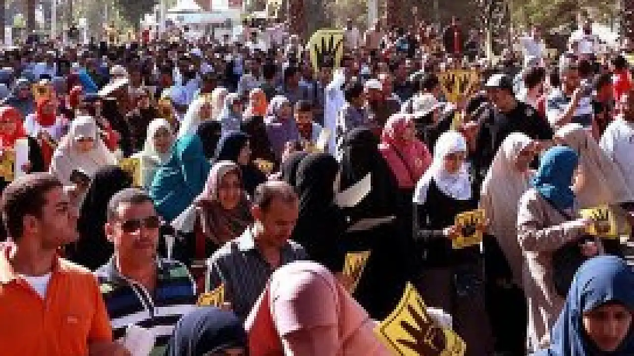 Ailece katılımın yüksek olduğu gözlemlenen yürüyüşlerde, protestocular Mursi ve şehit fotoğraflarının yanı sıra Rabia sembolleri ve Mısır bayrakları taşıyor.