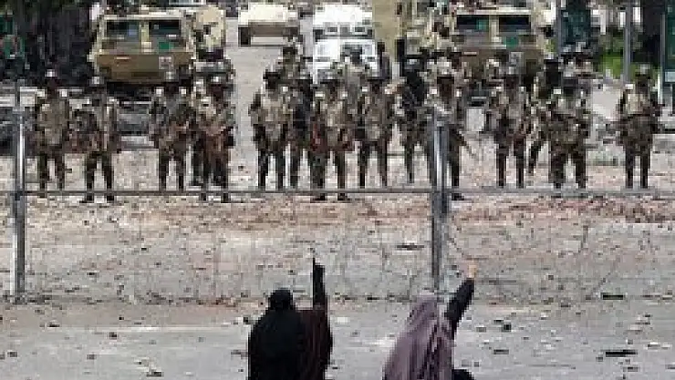 Dikenli teller arkasında konuşlanan askerlerle göstericiler arasında çatışmayı önlemek için gençler dikenli tellerin önünde etten duvar ördü.
