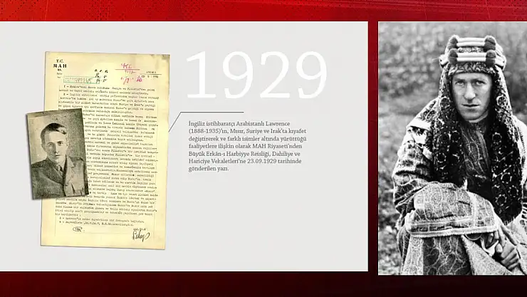 Bu belge, "Arabistanlı Lawrence" olarak bilinen ünlü İngiliz ajanı Thomas Edward Lawrence'ın, Mısır, Suriye ve Irak'ta kıyafet değiştirerek ve farklı isimler altında yürüttüğü faaliyetlere ilişkin olarak Milli Emniyet Hizmeti Riyaseti tarafından hazırlanan 23 Eylül 1929 tarihli yazı oldu.