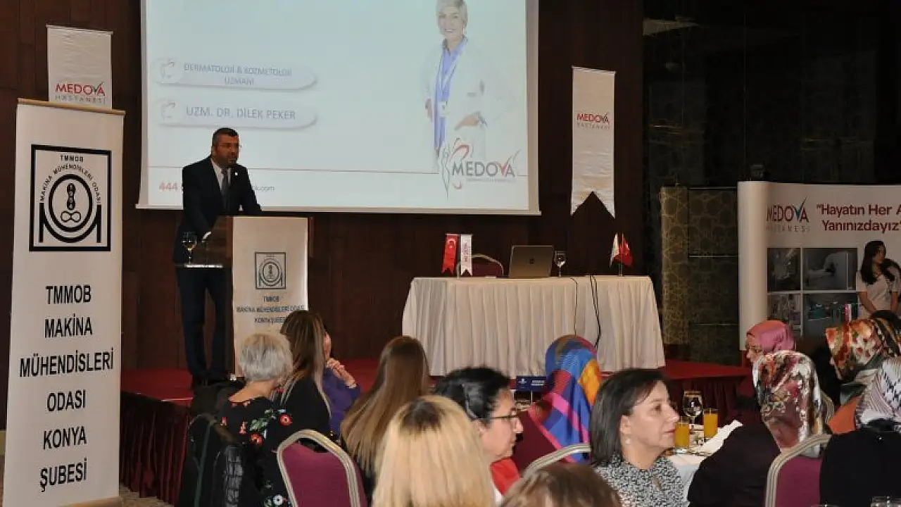 Bir otelde düzenlenen etkinlikte konuşan MMO Konya Şubesi Başkanı Dr. A. Hakan Altun, “Hepinizi şahsım ve Makina Mühendisleri Konya Şubesi Yönetim Kurulu adına saygıyla selamlıyorum. Dünya Kadınlar Günü münasebetiyle geleneksel hale gelen etkinliğimizde bu yılda bir arada olmanın mutluluğunu yaşıyorum. Bu güzel ve anlamlı günde bizlerle bir arada olduğunuz için hepinize ayrı ayrı teşekkür ederim. Kuruluş amacı üyelerine hizmet olan odamız, bu amaç doğrultusunda etkinlikler düzenlemeye devam etmektedir. Odamıza kayıtlı bayan üyelerimiz arasındaki kaynaşmayı, dayanışmayı ve birlikteliği artırmak Dünya Kadınlar Günündeki en önemli amacımızdır. Oldukça faydalı olacağına inandığım bu toplantımızı Medova Hastanesi işbirliğiyle gerçekleştirmekteyiz. Destek ve katkılarından dolayı Medova Hastanesi yetkililerine ve yapacağı sunumla etkinliğimize katkı sağlayacak değerli hocamız Uzman Dr. Dilek Peker’e huzurlarınızda hoş geldiniz diyor, kendilerine teşekkür ediyorum. Tarihimizin en eski dönemlerinden içinde bulunduğumuz güne kadar toplumsal hayatımızın, millet ve devlet yapımızın odağında yer alan, yaşamımızın doğumundan ölümüne kadar her anda varlıklarıyla onurlandığımız, gelecek nesillerin eğitiminde ve yetişmesinde liderlik yapan, sevgi ve şefkatlerini hiçbir karşılık beklemeden bizlere veren siz değerli hanımefendilerin Dünya Kadınlar Gününü kutlayarak saygılar sunuyorum” dedi.