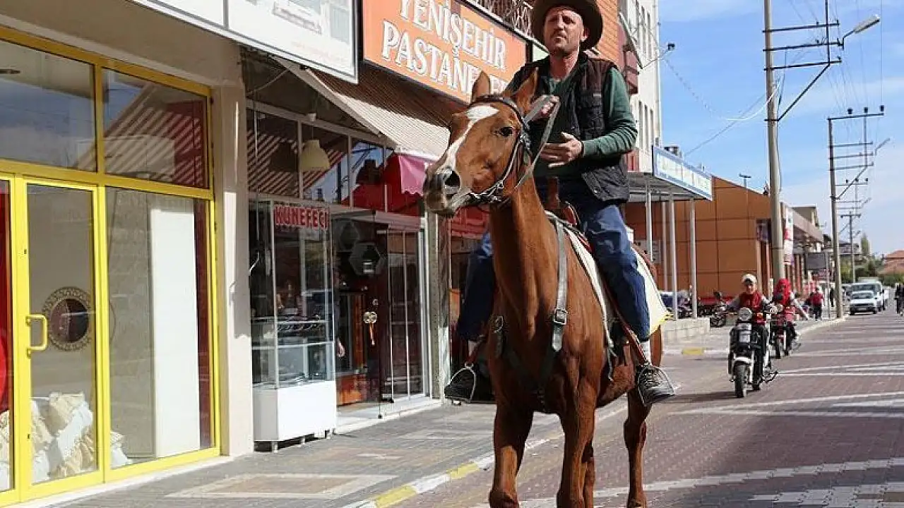 Nevşehir'in Acıgöl ilçesinde yaşayan Yavuz Yüce, belediyeden hastaneye, fırından markete kadar hemen her yere atıyla gidiyor.