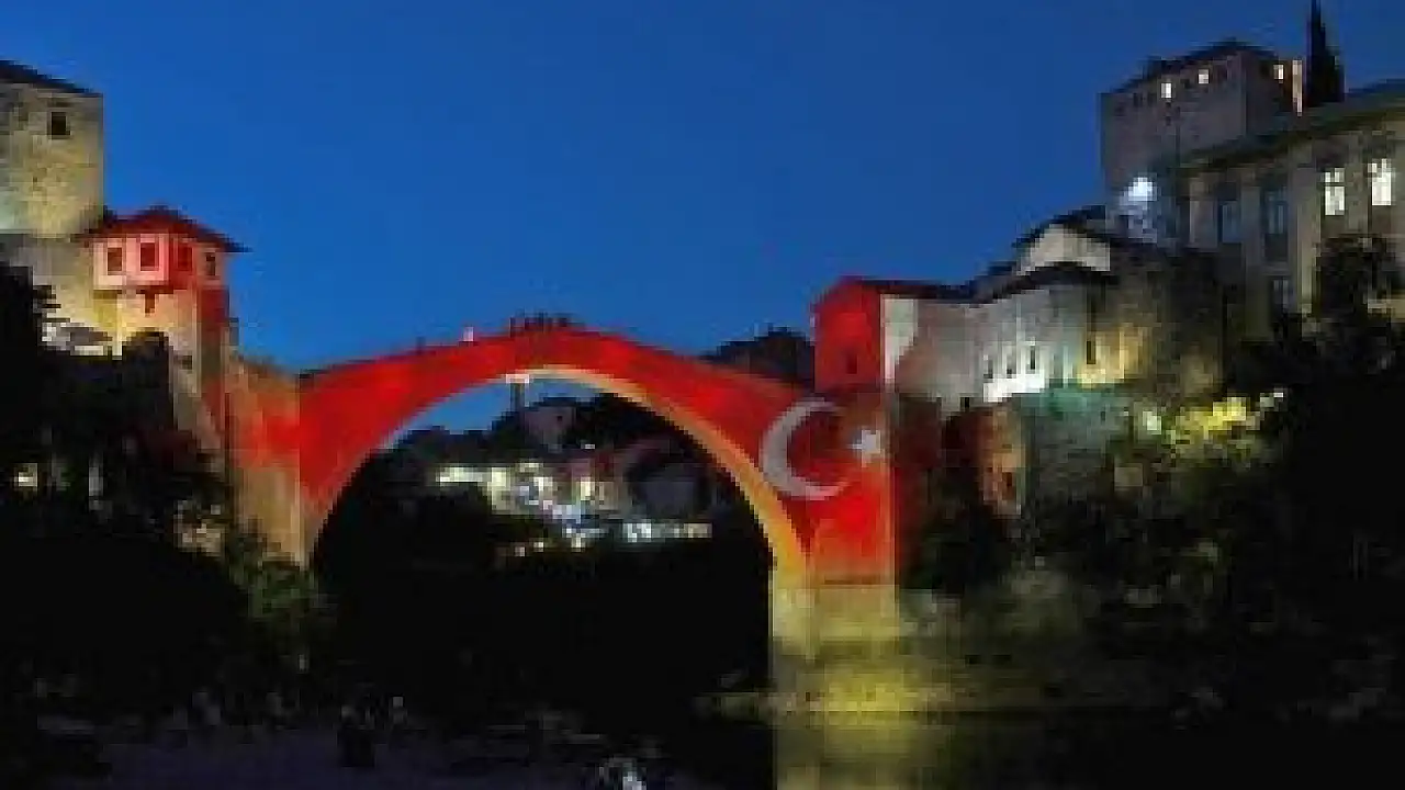 Mostar'daki Barış ve Çok Etnikli İşbirliği Merkezi'nin organizasyonunda, kentin en önemli simgesine Türk bayrağı yansıtılırken, Türkiye'yi hedef alan terör saldırılarının bir an önce sona ermesi mesajı verildi.