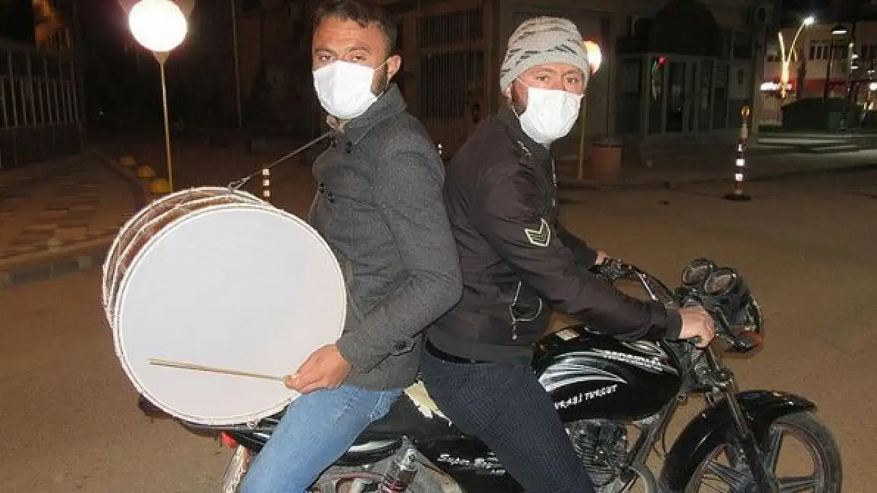 Afyonkarahisar Sandıklı'da motorize ekipler halinde görev yapan ramazan davulcuları, 'Eller çok yıkanacak, dirseğe hapşırılacak, sarılmak öpüşmek yok, sadece uzaktan bakılacak' gibi manilerle oruç tutmak isteyen vatandaşları sahura kaldırıyor.