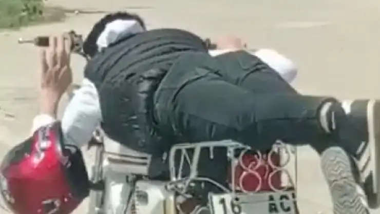 Görüntüler İnegöl ilçesi, Bursa-Ankara yolunda kaydedildi. İnegöl'den Bursa istikametine seyir halinde olan kasksız sürücü, motosikletin üzerine yüzüstü yattı. Motosikleti bir süre bu şekilde kullanan ve zaman zaman hızını 100 kilometreye kadar çıkaran sürücüyü görenler o anları görüntüledi.