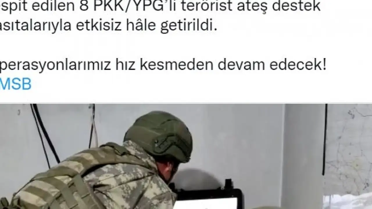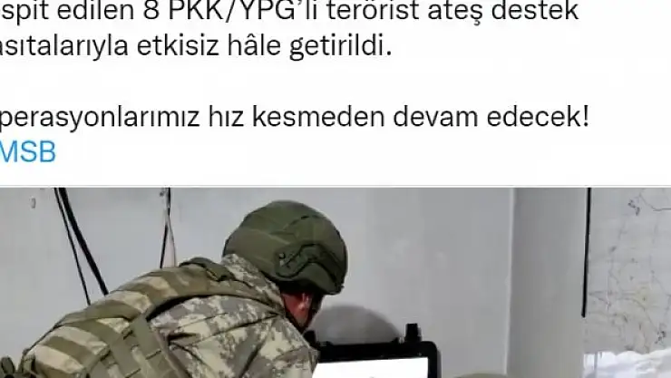 MİLLİ Savunma Bakanlığı (MSB), Fırat Kalkanı, Zeytin Dalı ve Barış Pınarı bölgelerinde 8 PKK/YPG'li teröristin etkisiz hale getirildiğini açıkladı.