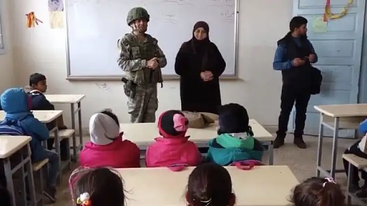 Bakanlığın Twitter hesabından yapılan paylaşımda, Mehmetçiğin sınıflarda öğrencilere hediyeler verdiği anlara ilişkin görüntüler yer alıyor.