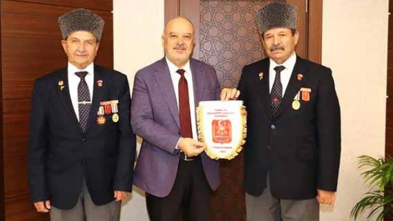 Türkiye Muharip Gaziler Derneği Konya Şube Başkanı Gazi Mustafa Bugur ve Gazi Hikmet Akar, Karatay İlçe Müftüsü Musa İmamoğlu'nu makamında ziyaret etti.