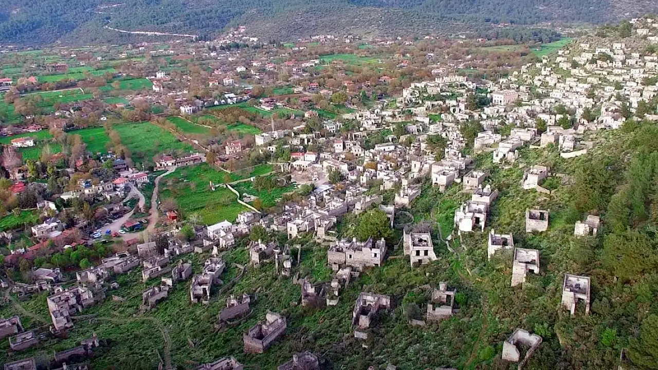 Muğla'nın dünyaca ünlü turistik ilçesi Fethiye'de "hayalet köy" olarak bilinen ve 65 yıl önce terk edilen Kayaköy, havadan görüntülendi.