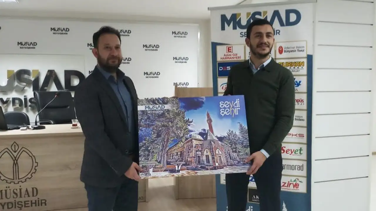 Seydişehir Müsiad üyelerinin katıldığı konferansın sonunda MÜSİAD Seydişehir Başkanı Mustafa Akman, konuk Nurullah Mahmut Dündar'a günün anısına bir hediye verdi.