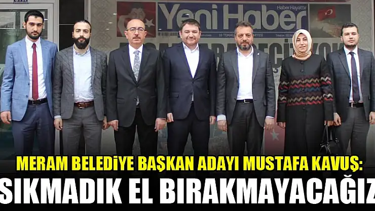 Meram Belediye Başkan Adayı Mustafa Kavuş Yeni Haber'i ziyaretinde yaptığı açıklamada, 'Meram ilçemiz için gece gündüz demeden çalışmalarımızı sürdürüp vatandaşlarımızın isteklerine çare bulabilmek için sıkmadık el bırakmayacağız' dedi.