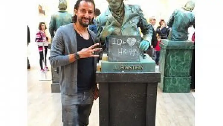 büstü önünde çektirdiği fotoğrafı paylaştı. Fotograftaki ilginç ayrıntı ise parmaklarını Albert Einstein gibi yapıp yazı tahtasına ise IQ+ = HK99 yazdı.