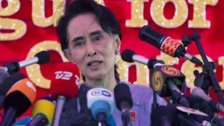 Suu Kyi -- standing in front of a bright red background, decorated with the white star and dancing peacock of the NLD flag -- also said that she would not make a decision on her own about amending a 1982 law that denies many Rohingya citizenship.