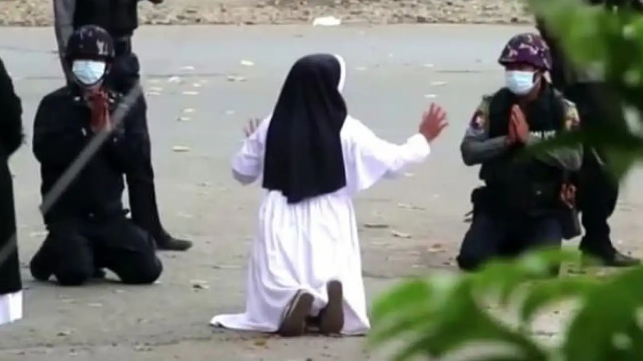 Darbe karşıtı protestoların düzenlendiği Myanmar'da tansiyon düşmüyor. Güvenlik güçlerinin en az 60 kişiyi öldürdüğü ülkede, Myitkyina kentinde bir rahibe, çocuklara ve bölge sakinlerine zarar vermemeleri için polise diz çökerek yalvardı.