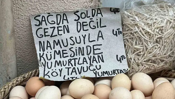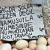 Sinoplu bir manav, köy yumurtalarının, gezen tavuk yumurtaları ile kıyaslanması üzerine sattığı yumurtaların üzerine esprili bir not yazdı.