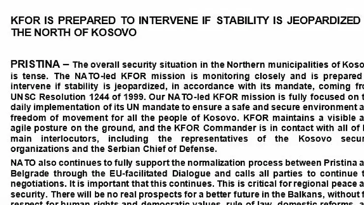 Sırbistan ve Kosova arasında yaşanan gerginliğin ardından açıklama yapan NATO'nun Kosova Gücü (KFOR), Kosova'nın kuzeyindeki genel güvenlik durumunun gergin olduğunu belirterek, istikrarın tehlikeye girmesi durumunda müdahale etmeye hazır olduğunu duyurdu.