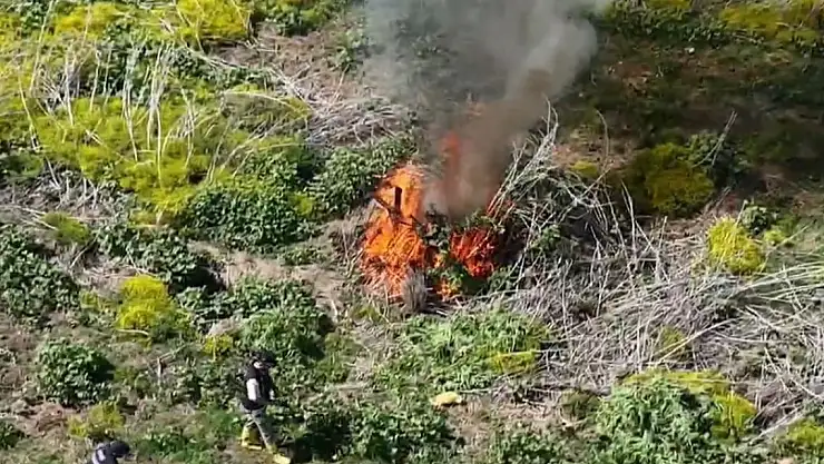 Burada ele geçirilen ve piyasa değeri 100 milyon Türk Lirası'ndan fazla olan yaklaşık 300 kilogram skunk-esrar üretimine elverişli kök kenevir bitkisi yok edildi.