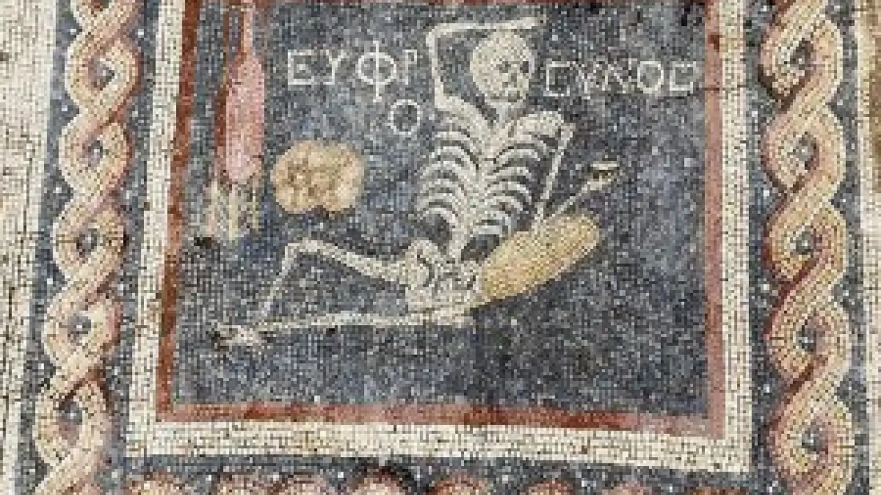 "Mustafa Kemal Üniversitesinden Arkeoloji Bölümü Öğretim Üyesi Doç. Dr. Hatice Pamir, onu 'iskelet mozaik' olarak adlandırdı ve mozaik üzerinde yaptığı bilimsel çalışma sonucunda, milattan önce 3. yüzyılda bir evin yemek salonuna ait mozaik olduğunu tespit etti. Mozaik üzerinde üç sahne var. Siyah tessara üzerine yapılmış cam mozaikler. Roma döneminde elit sınıfın arasında sosyal etkinlik olarak iki şey çok önemli. Biri hamam olayı ikincisi ise akşam yemeği. Birinci sahnede bir zenci, kürekle ateş atıyor. Bu hamamı simgeliyor. Orta sahnede ise güneş saati ve ona koşan giysili bir genç ve arkasında çıplak kafalı bir uşağı var. Güneş saati 9 ile 10 arasında. Saat 9.00 Romalılarda hamam saati. Saat 10.00'da ise akşam yemeğine yetişmek zorunda. Eğer yetişmezse çok ayıp karşılanıyor. Orta sahnede böyle bir anlatım var. Sahne üzerinde yemeğe geç kaldığını belirten bir yazı var. Diğerinde de zaman kavramını anlatan bir yazı yer alıyor. Son sahnede ise ehli keyif bir iskelet. Elinde içki kasesi yanında bir ekmek ve şarap testisi. Onun üzerindeki yazıda da Grekçe 'Neşeli ol hayatını yaşa' yazıyor. Türkiye'de eşi olmayan bir mozaik. İtalya'da buna benzer bir mozaik var. Ama bu daha geniş kapsamlı. Bu sahne üzerinde tek olması açısından ve milattan önce 3. yüzyıla ait olması açısından önemli."