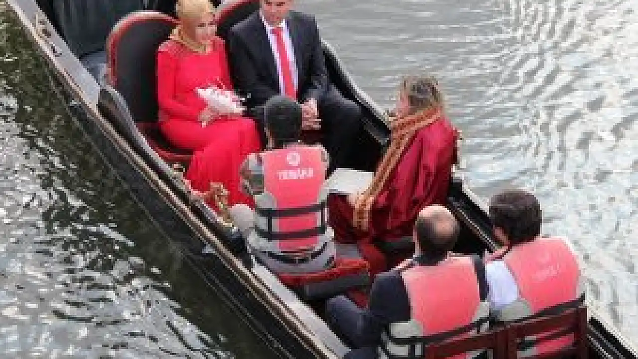 Türkiye'nin önemli turizm merkezlerinden Avanos'ta genç bir çift, Kızılırmak Nehri'nde gondolda kıyılan nikahla evlendi.
