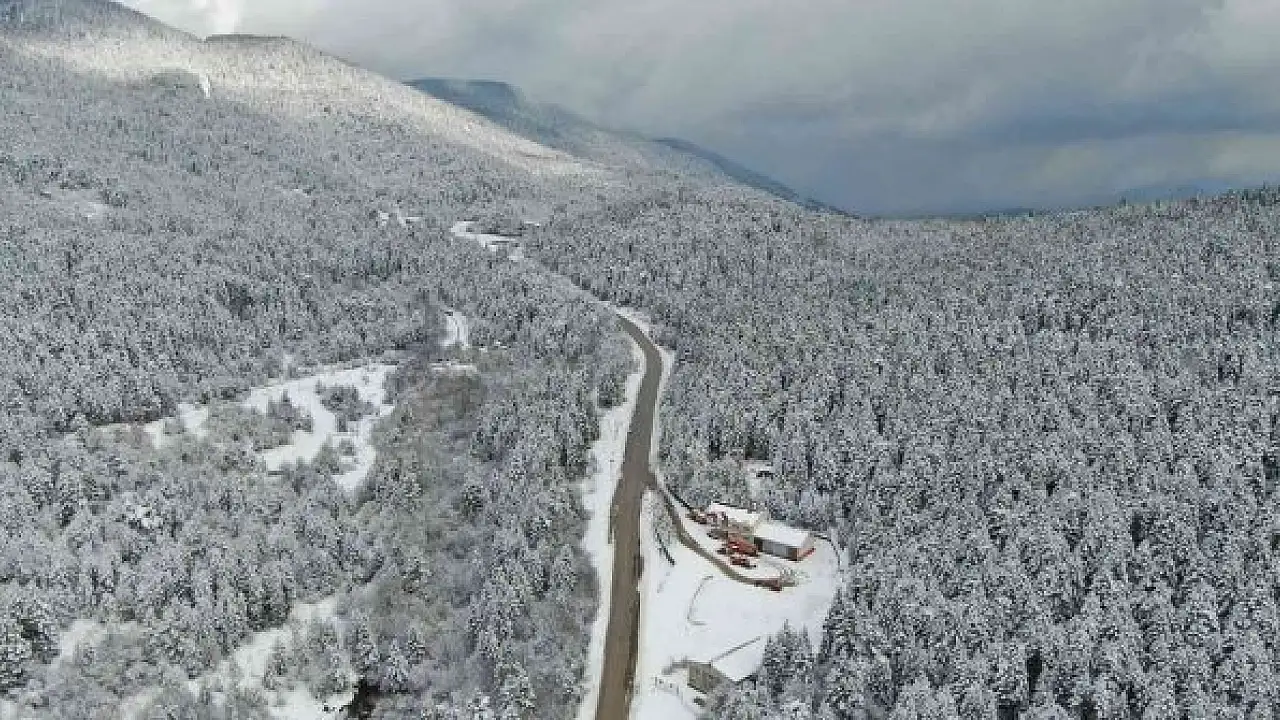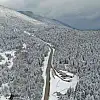 Karabük - Bartın Karayolu 1030 rakımlı Ahmetusta geçidinde sabah karşı etkili olan kar yağışı sonrası karayolları ekipleri yol güzergahında kar küreme ve tuzlama çalışması yaparken, zaman zaman güneşinde yüzünü gösterdiği bölgede beyaz örtüyle kaplanan eşsiz doğa ise havadan dron ile görüntüledi.