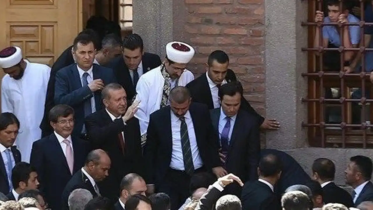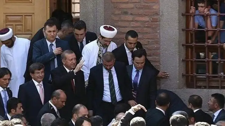 Haberde Cumhurbaşkanı Erdoğan ve Başbakan Davutoğlu'nun Ankara'da Hacı Bayram Veli Camii'nden çıkarken çekilen fotoğrafı servis ediliyor.