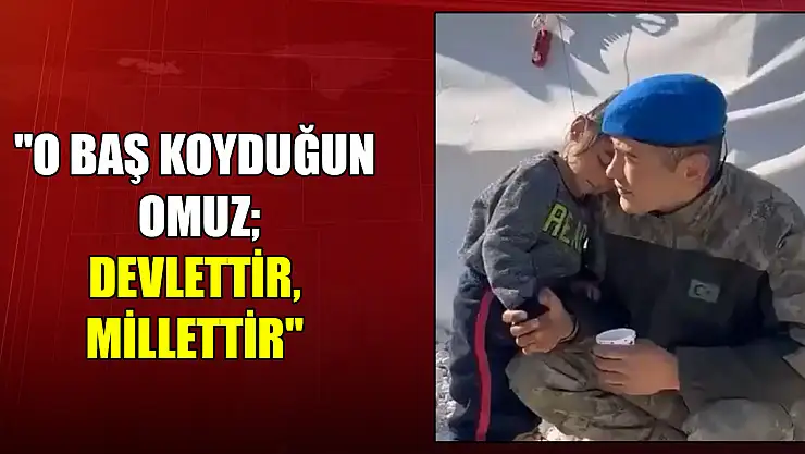 MİLLİ Savunma Bakanlığı (MSB), depremzede bir çocuğun yere çömelmiş askerin omzuna başını dayadığı görüntüyü, "O baş koyduğun omuz; devlettir, millettir" notu ile paylaştı.