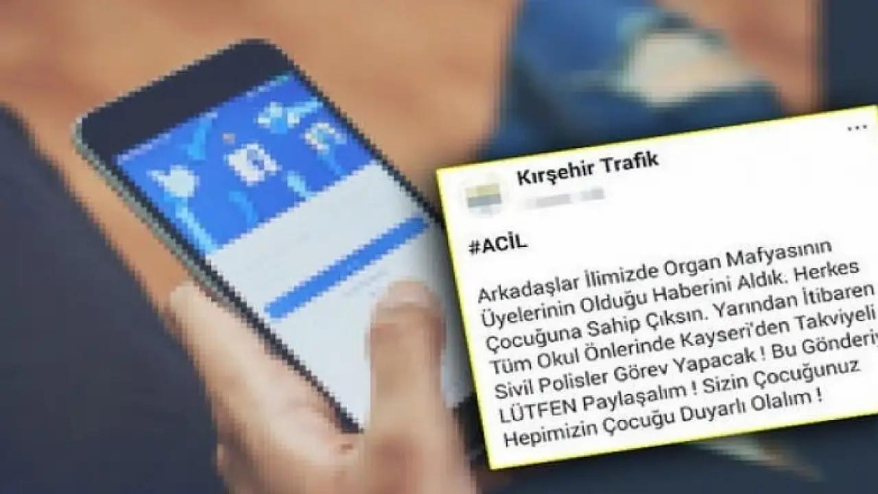 Bir sosyal medya hesabından “Arkadaşlar, ilimizde organ mafyasının üyeleri olduğunu öğrendik. Herkes çocuğuna sahip çıksın. Kayseri'den polisler gelerek okul önlerinde denetimler yapacak" diye paylaşım yapılması üzerine İl Emniyet Müdürlüğü Güvenlik Şube Müdürlüğü ekiplerince çalışma başlatıldı.