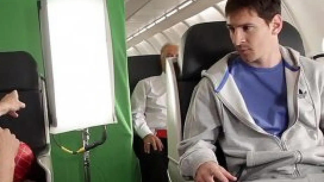 Görüntülerde Messi ile Bryant, reklam filmi için hazırlanıyor, uçak içinde kafa ile top sektiriyor ve komik hareketlerde bulunuyor.