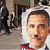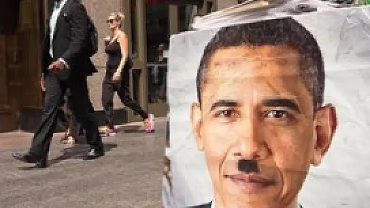 New York'ta gerçekleşen bir banka protestosu sırasında ABD Başkanı Obama'nın Hitler bıyıklı posteri kullanıldı.