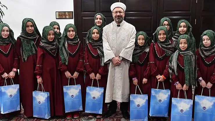 Diyanet İşleri Başkanı Prof. Dr. Ali Erbaş, 2018 Dünya Robot Yarışması'nda 'En popüler takım' ödülünü alan Bedir Kız Kur'an Kursu hafızlık öğrencilerini makamında kabul etti.