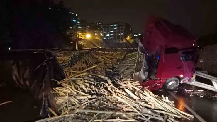 Zonguldak'ın Kozlu ilçesinde seyir halindeki odun yüklü tır yola devrildi.