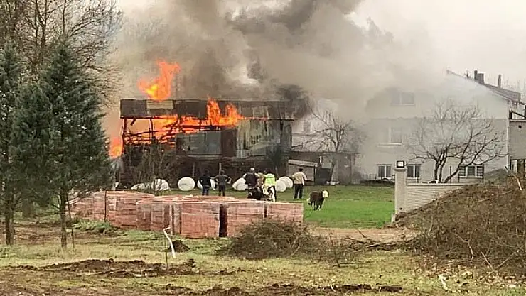 Düzce'nin Şıralık Mahallesi'nde meydana gelen yangında, ahır ve odunluk alev alev yandı.