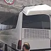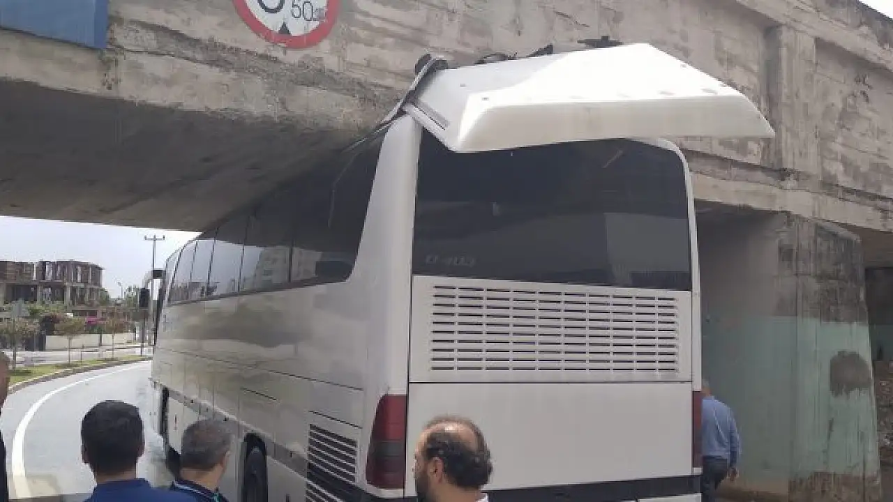Öğrenci taşıyan tur otobüsü üst geçide sıkıştı