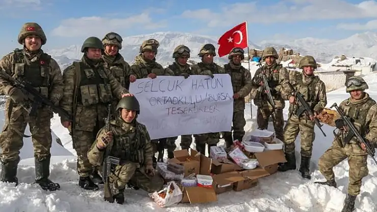 Bursa'da ortaokul öğrencilerinin hazırladığı yiyecekler ile kaleme aldığı mektup ve şiirler, terörle mücadelenin yoğun şekilde sürdüğü Hakkari'nin Çukurca ilçesindeki Güven Dağı askeri üs bölgesinde görev yapan Mehmetçik'e ulaştırıldı.