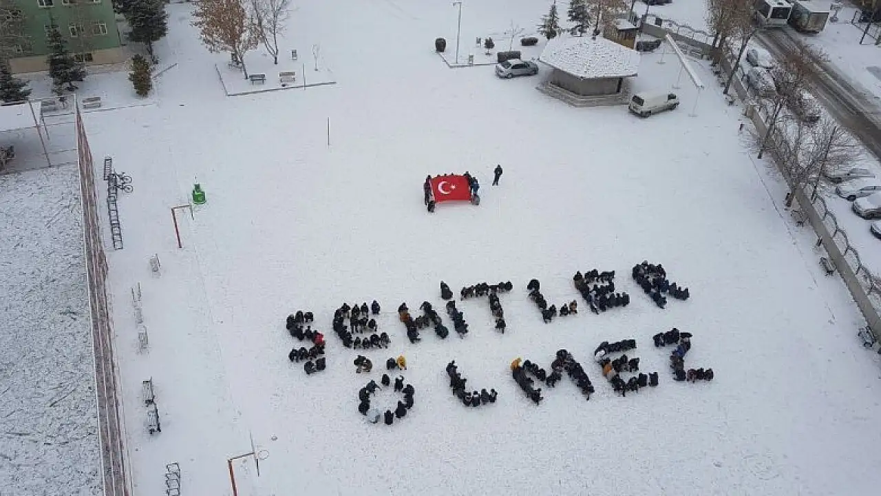 Öğrenciler, karla kaplı okul bahçesine bedenleriyle "Şehitler Ölmez" yazdı.