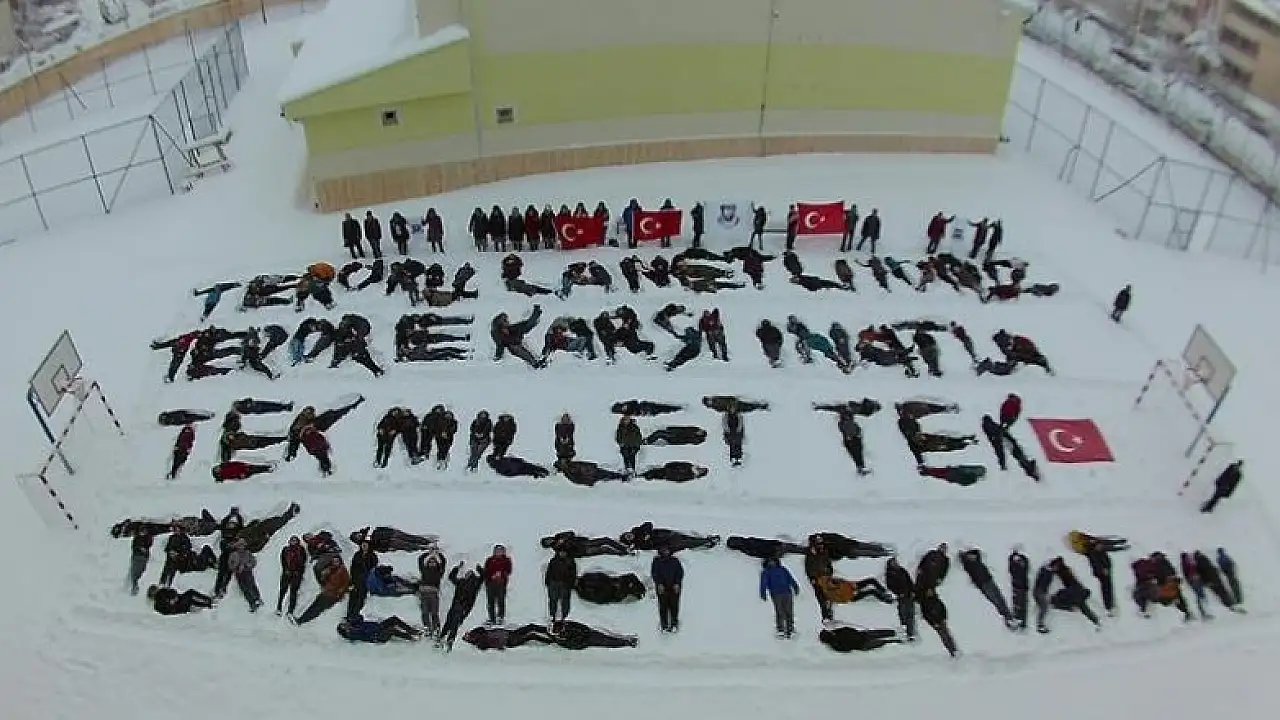 Öğrenciler, karla kaplı okul bahçesinde "Terörü Lanetliyoruz. Teröre Karşı İnatla, Tek Millet, Tek Bayrak, Tek Vatan" yazısını oluşturdu.
