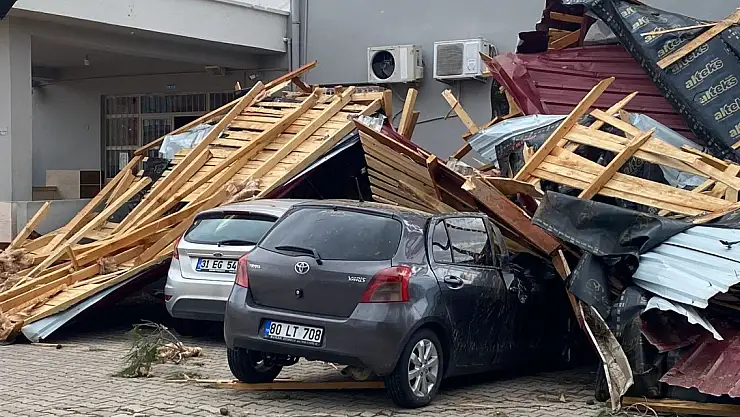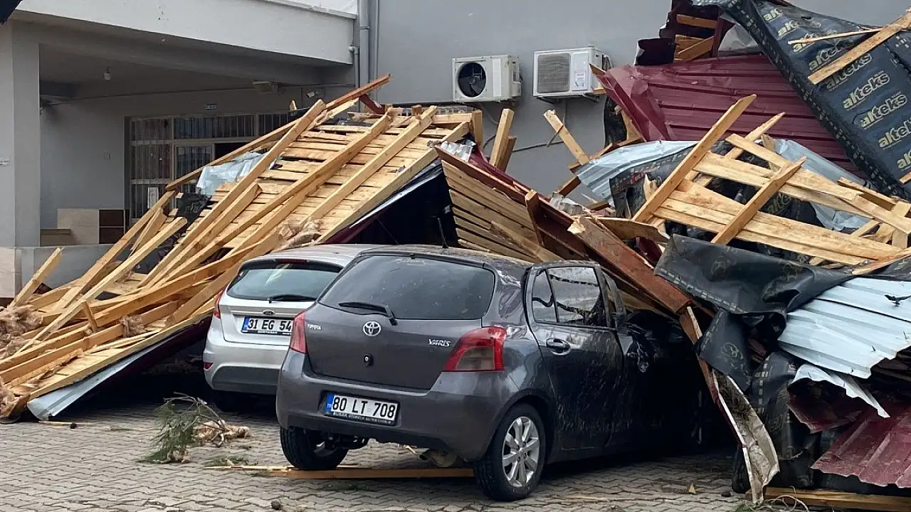 Osmaniye'de sağanak yağış ve fırtınada bir okulun çatısı uçtu. Çatının üzerinde düştüğü park halindeki iki otomobilde hasar oluştu.